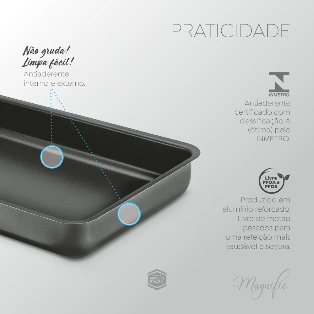 A Assadeira Antiaderente Grafite Magnific 38x26x6cm é uma assadeira retangular fabricada em alumínio com revestimento antiaderente, ideal para assar bolos, tortas, carnes e legumes. Apresenta dimensões de 38 x 26 x 6 cm.