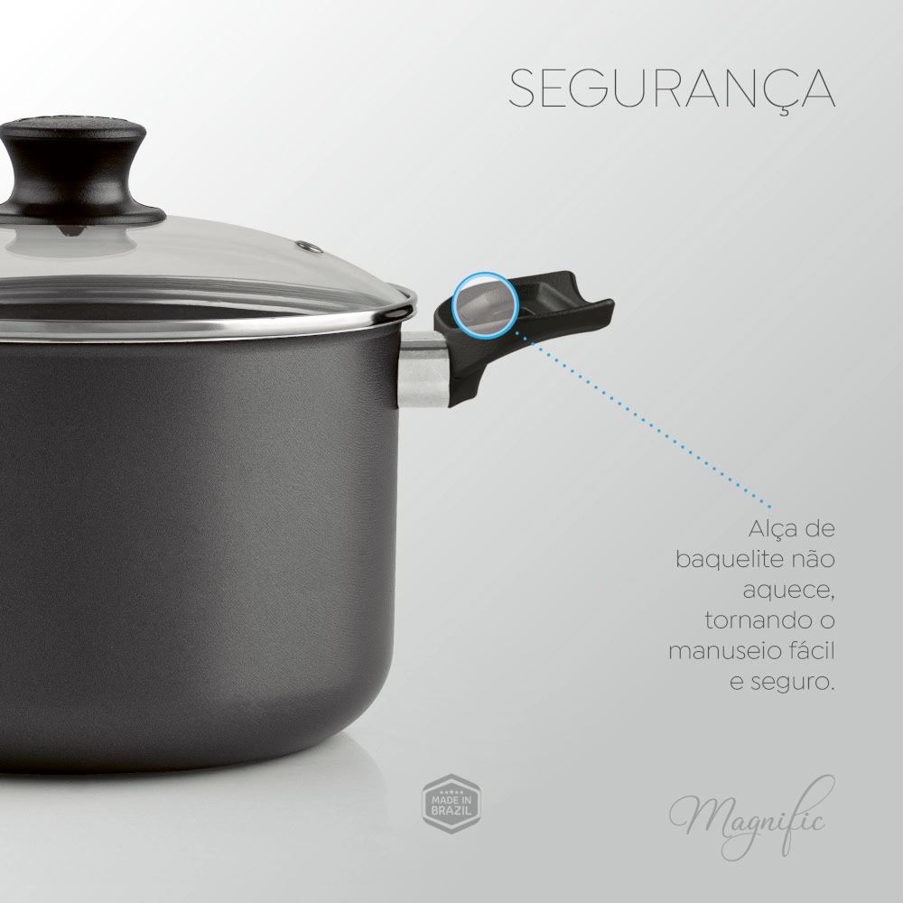 O caldeirão Panelux Magnific é um utensílio muito útil e tradicional na cozinha. Aqui estão alguns dos principais benefícios desse versátil utensílio: Tecnologia Antiaderente Eficiente – A linha Magnific é equipada com 5 camadas de antiaderente. tanto internas quanto externas. garantindo que seus alimentos não grudem e facilitando a limpeza. Prepare suas refeições favoritas sem se preocupar com sujeira ou resíduos!