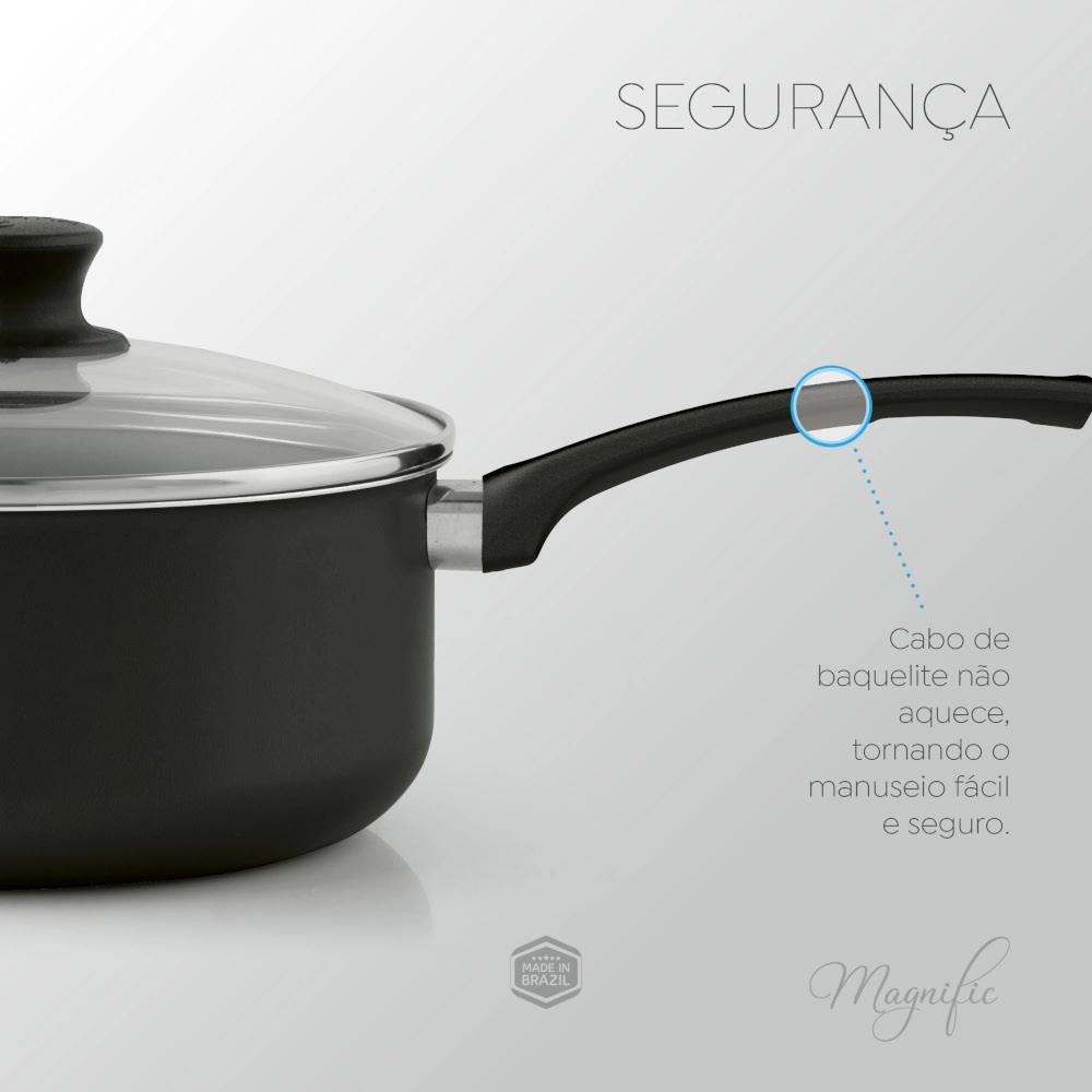 Apresentamos o kit de 5 peças da linha de panelas Panelux. uma escolha ideal para quem busca praticidade e eficiência em uma cozinha compacta. Com uma seleção cuidadosamente elaborada. este conjunto é perfeito para atender às necessidades do dia a dia. possibilitando uma variedade de preparos. Tecnologia Antiaderente Eficiente – A linha Magnific é equipada com 5 camadas de antiaderente. tanto internas quanto externas. garantindo que seus alimentos não grudem e facilitando a limpeza. Prepare suas refeições favoritas sem se preocupar com sujeira ou resíduos!