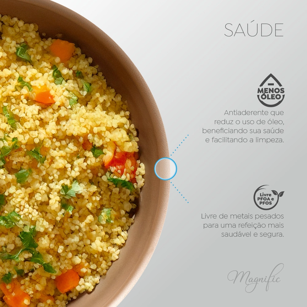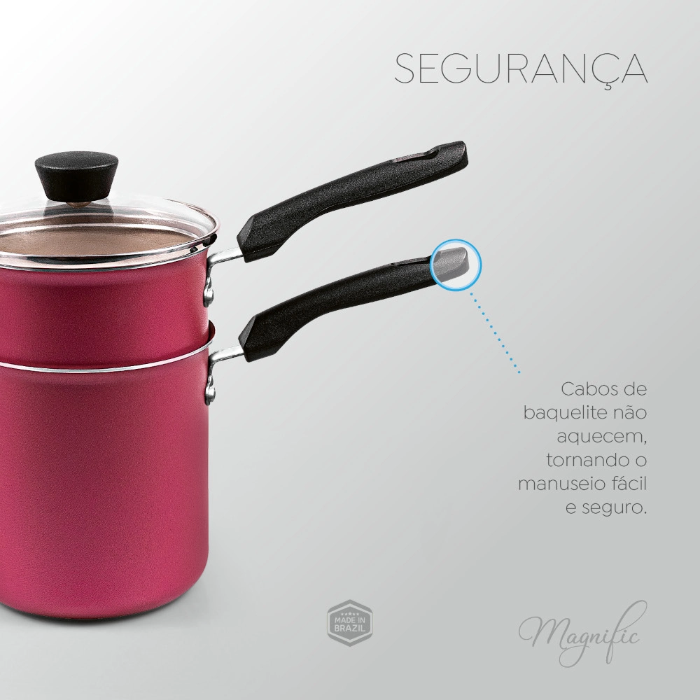 Com um design inteligente e compacto, ele possui duas seções que otimizam a distribuição de calor, a base com 110mm de altura por 100mm de diâmetro, ideal para um aquecimento uniforme e eficiente, já a parte superior possui 60mm de altura, mantendo a mesma dimensão de 100mm de diâmetro, garantindo versatilidade e performance no cozimento. Pensado para atender as demandas do dia a dia, o Cuscuzeiro Panelux Magnific é perfeito para quem valoriza praticidade sem abrir mão do sabor e da qualidade. Seja para um café da manhã rápido, um almoço descomplicado ou aquele jantar especial, este cuscuzeiro se destaca pela sua eficiência e design moderno.