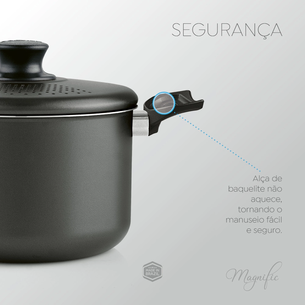 A espagueteira Panelux Magnific é realmente um utensílio valioso para quem gosta de cozinhar massas. Aqui estão algumas das principais vantagens desse utensílio: Tecnologia Antiaderente Eficiente – A linha Magnific é equipada com 5 camadas de antiaderente. tanto internas quanto externas. garantindo que seus alimentos não grudem e facilitando a limpeza. Prepare suas refeições favoritas sem se preocupar com sujeira ou resíduos!