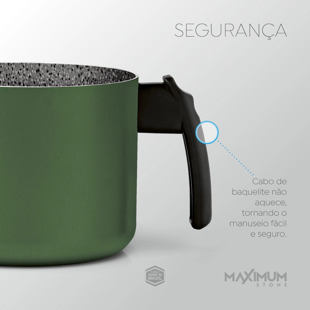 Ideal para aquecer líquidos. preparar bebidas e até cozinhar pequenas porções. o fervedor Panelux Maximun Stone é uma adição prática à sua rotina culinária. Nosso ferverdor Maximum Stone conta com 7 camadas de antiaderente de alta tecnologia. garantindo um cozimento saudável e facilitando a limpeza. Além disso. a linha possui antiaderente externo e cabos em baquelite que não aquecem. proporcionando segurança e conforto durante o manuseio.