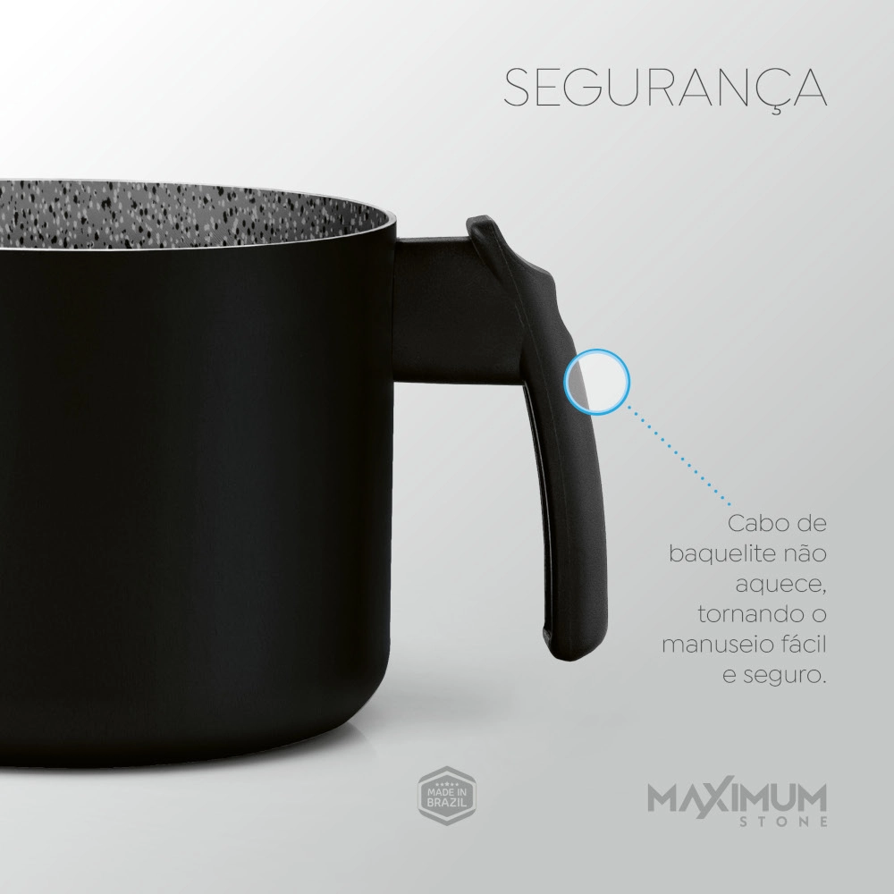 Ideal para aquecer líquidos. preparar bebidas e até cozinhar pequenas porções. o fervedor Panelux Maximun Stone é uma adição prática à sua rotina culinária. Nosso ferverdor Maximum Stone conta com 7 camadas de antiaderente de alta tecnologia. garantindo um cozimento saudável e facilitando a limpeza. Além disso. a linha possui antiaderente externo e cabos em baquelite que não aquecem. proporcionando segurança e conforto durante o manuseio.