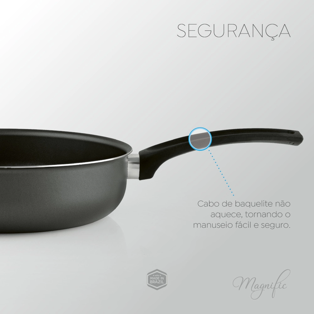 A base em alumínio distribui o calor de maneira uniforme, garantindo cozimento por igual. O cabo em baquelite antitérmico oferece segurança e conforto durante o manuseio.