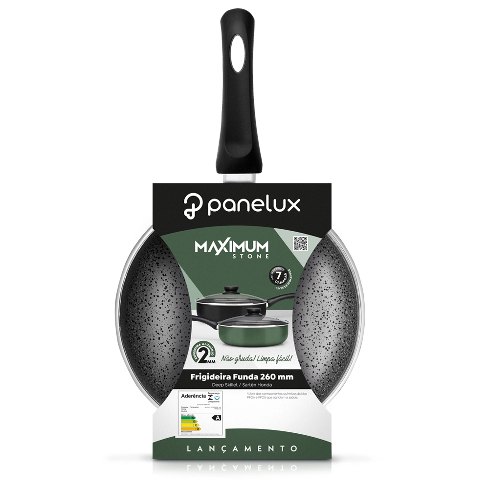A frigideira funda Panelux da linha Maximum Stone com tampa é a escolha certa para quem busca versatilidade e praticidade na cozinha. sendo ideal para preparar uma grande variedade de pratos com facilidade. Você tem a praticidade que precisa para cozinhar com mais eficiência e facilidade. garantindo resultados deliciosos em cada prato. Mais espaço para cozinhar Com suas laterais altas. essa frigideira é perfeita para receitas que precisam de mais espaço. como molhos. risotos ou pratos com maior quantidade de líquido. O design facilita o preparo de porções maiores e evita respingos indesejados.