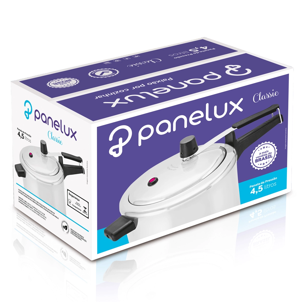 A Mais Vendida do Brasil Eleve sua experiência na cozinha com a Panela de Pressão Panelux Magnific Alto Brilho, a mais vendida do Brasil, de acordo com a pesquisa Nielsen de junho de 2023. Nossa panela combina design sofisticado, qualidade e eficiência para tornar cada refeição especial. A nossa linha de panelas de pressão conta com cabos de baquelite, que não aquecem durante o uso. Também possuímos a valvula de segurança para melhor uso da panela. Isso garante um manuseio fácil e seguro, para você cozinhar com tranquilidade e praticidade. Desenvolvida com uma variedade de capacidades – de 3 a 10 litros – e espessuras que garantem durabilidade, ela se adapta perfeitamente à sua rotina, seja para o preparo de refeições do dia a dia ou para grandes eventos. A tecnologia avançada da Panelux Magnific proporciona cozimento rápido e eficiente, resultando em uma economia significativa de gás de cozinha. Cozinhar nunca foi tão prático e saudável. Com a Panelux Magnific, suas refeições são preparadas com rapidez, preservando o sabor e os nutrientes. Ideal para feijões, carnes, sopas e muito mais, ela é o item indispensável para quem ama cozinhar com agilidade e segurança. 3 litros com 1,4 mm de espessura 4 litros com 1,4 mm de espessura 4,5 litros com 1,4 mm de espessura 7 litros com 1,8 mm de espessura 10 litros com 2,3 mm de espessura Essa variedade permite que você escolha a panela ideal, seja para preparar refeições individuais ou para toda a família. Economia de Gás de Cozinha Desenvolvida com tecnologia avançada, a panela de pressão Panelux Magnific é projetada para proporcionar uma economia significativa de gás de cozinha. Seu sistema de cozimento rápido reduz o tempo de preparo, permitindo que você cozinhe de forma mais eficiente e econômica. Rapidez nos Cozimentos Com a panela de pressão Panelux Magnific, você pode preparar alimentos de maneira ágil, mantendo os sabores e nutrientes. Ideal para quem tem uma rotina agitada, essa panela é perfeita para sopas, feijões, carnes e muito mais, garantindo refeições saborosas em menos tempo.