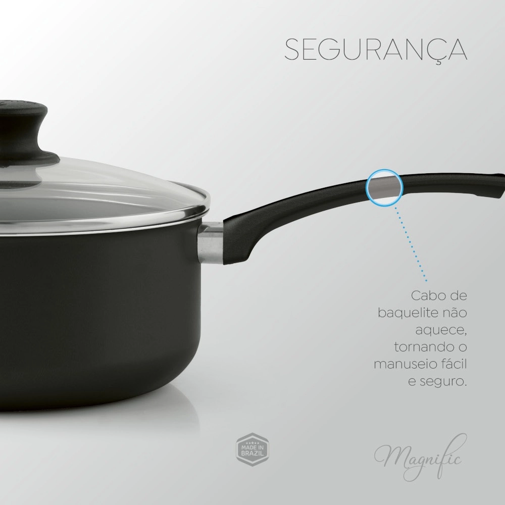 As panelas pequenas são ideais para porções menores. permitindo que você prepare refeições rápidas e práticas. Elas são perfeitas para aquecer sobras. cozinhar pequenas quantidades de legumes ou preparar molhos. economizando tempo e evitando desperdícios. Tecnologia Antiaderente Eficiente – A linha Magnific é equipada com 5 camadas de antiaderente. tanto internas quanto externas. garantindo que seus alimentos não grudem e facilitando a limpeza. Prepare suas refeições favoritas sem se preocupar com sujeira ou resíduos!