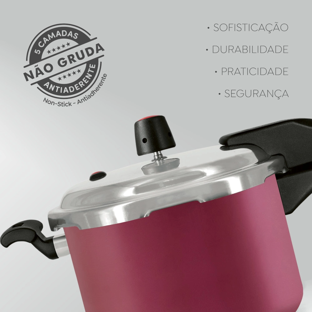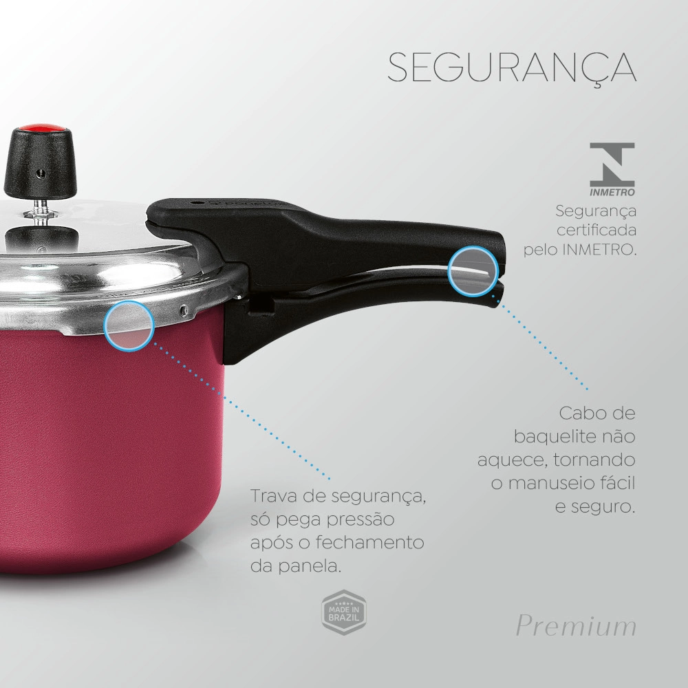 A Panela de Pressão Antiaderente Fechamento Externo Cereja Premium 4.5L é uma panela de pressão da linha Premium fabricada em alumínio com revestimento antiaderente. Possui capacidade de 4,5 L e fechamento externo, permitindo cozinhar alimentos sob alta pressão para reduzir o tempo de preparo e preservar os nutrientes.