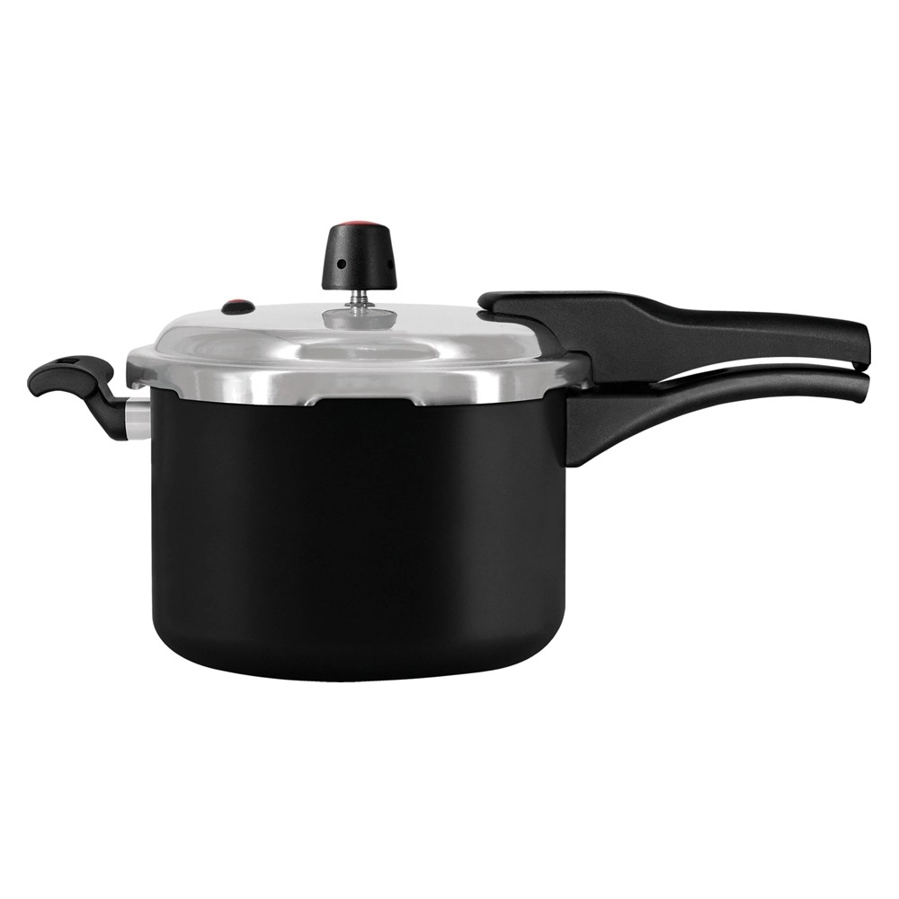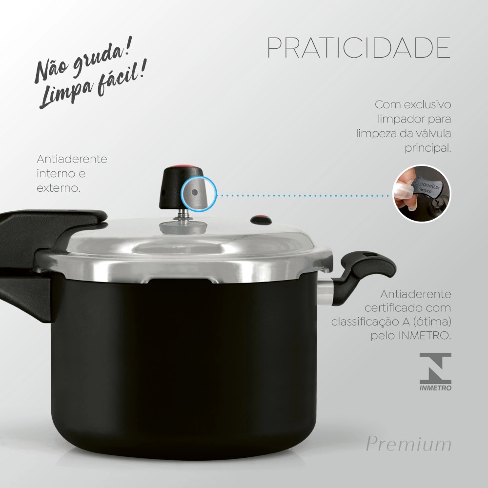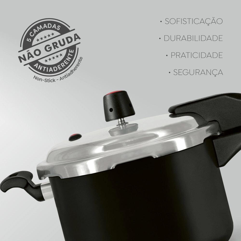 A Panela de Pressão Antiaderente Fechamento Externo Preta Premium 4.5L é uma panela de pressão da linha Premium fabricada em alumínio com revestimento antiaderente. Possui capacidade de 4,5 L e fechamento externo, permitindo cozinhar alimentos sob alta pressão para reduzir o tempo de preparo e preservar os nutrientes.