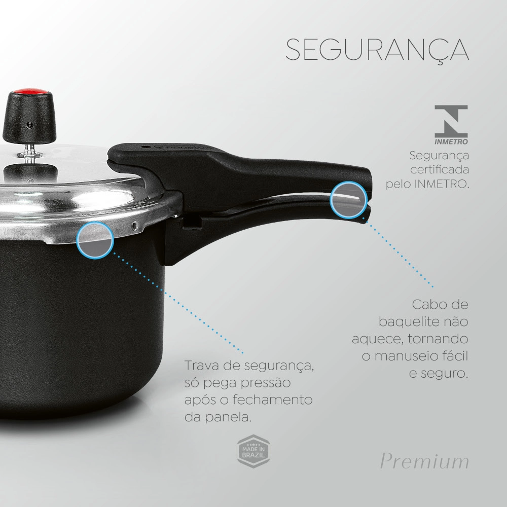 O corpo em alumínio distribui o calor de forma uniforme. O fechamento externo sela a tampa, permitindo que a pressão aumente. A válvula e a trava de segurança liberam o vapor excessivo e evitam abertura acidental, garantindo um uso seguro. As alças em baquelite antitérmico proporcionam manuseio seguro.