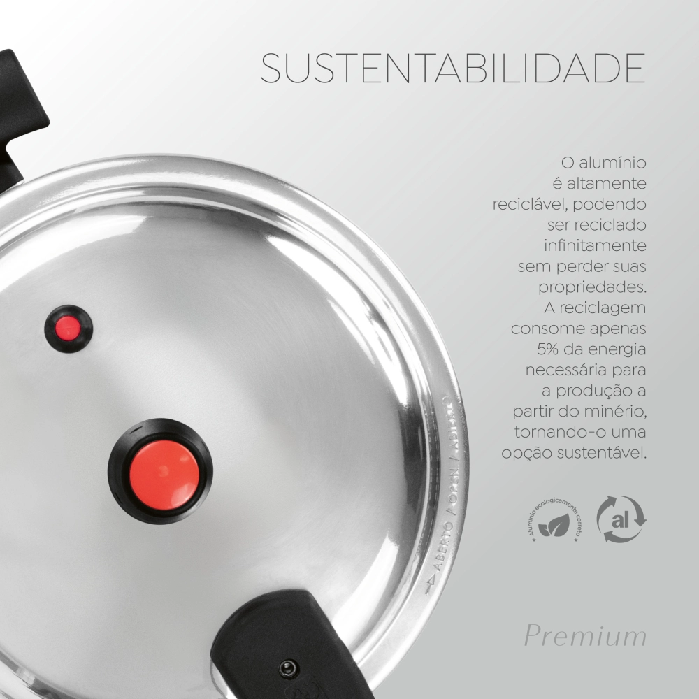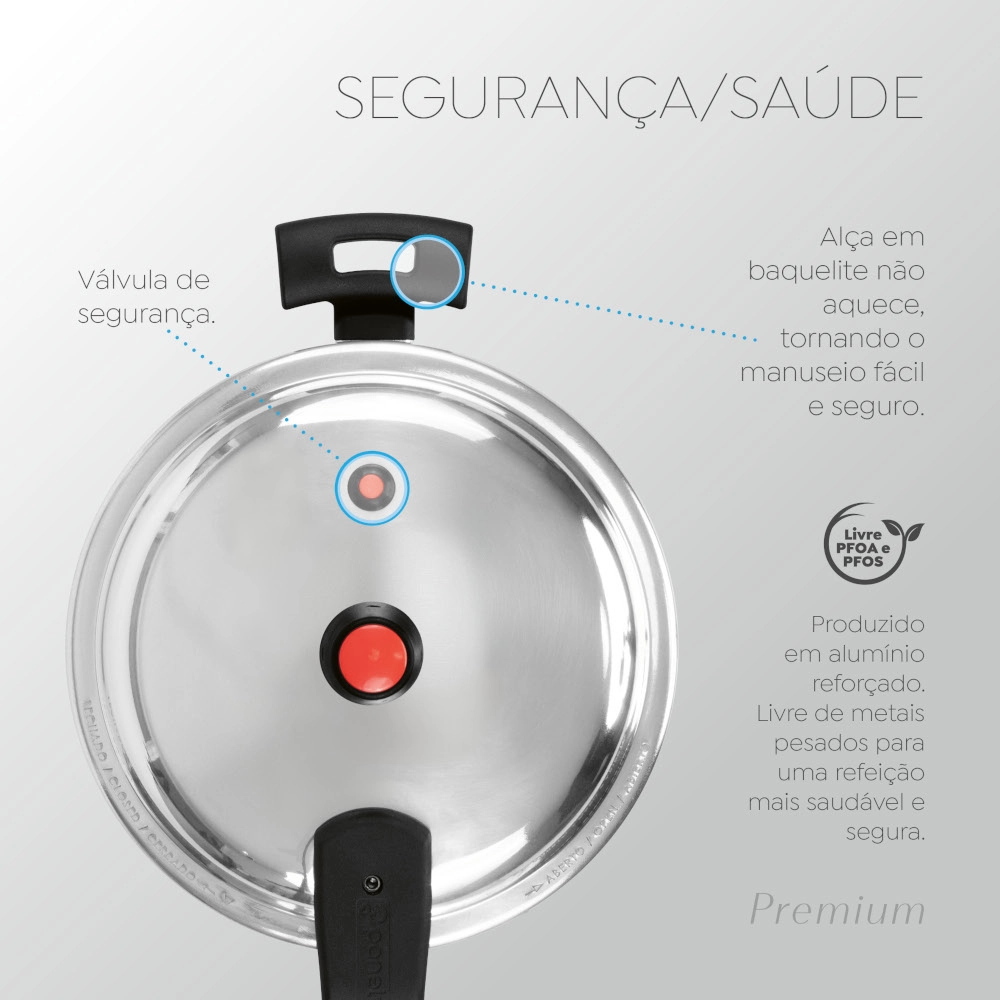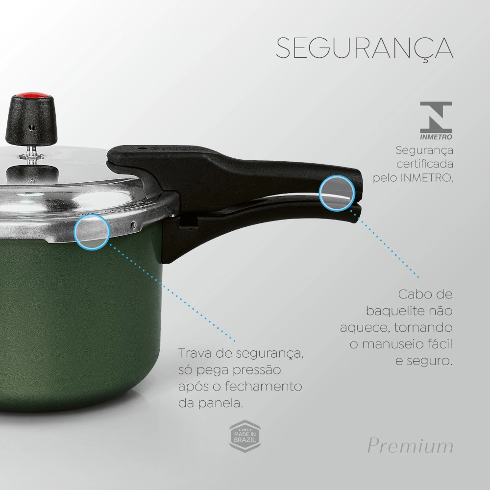 Linha de Panelas de Pressão Panelux Premium com Fechamento Externo – Segurança e Eficiência para a Sua Cozinha Apresentamos a nova linha Panelux Premium com fechamento externo. projetada para oferecer a combinação perfeita de robustez. praticidade e segurança. Com características inovadoras. essas panelas são ideais para quem busca qualidade e eficiência no preparo de suas receitas. A linha de panelas de pressão que você adora vem equipada com cabos de baquelite. que não aquecem e garantem um manuseio prático e seguro. Cozinhe com confiança. sabendo que sua segurança está em primeiro lugar! Trava de Segurança A linha Panelux Premium conta com uma trava de segurança que garante que a panela só atinja a pressão adequada quando estiver totalmente travada. Esse recurso é essencial para evitar aberturas acidentais. garantindo uma utilização segura e protegida durante o cozimento.