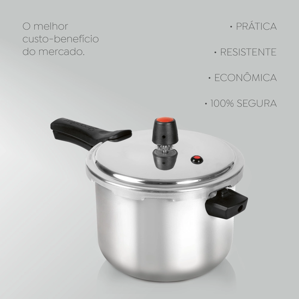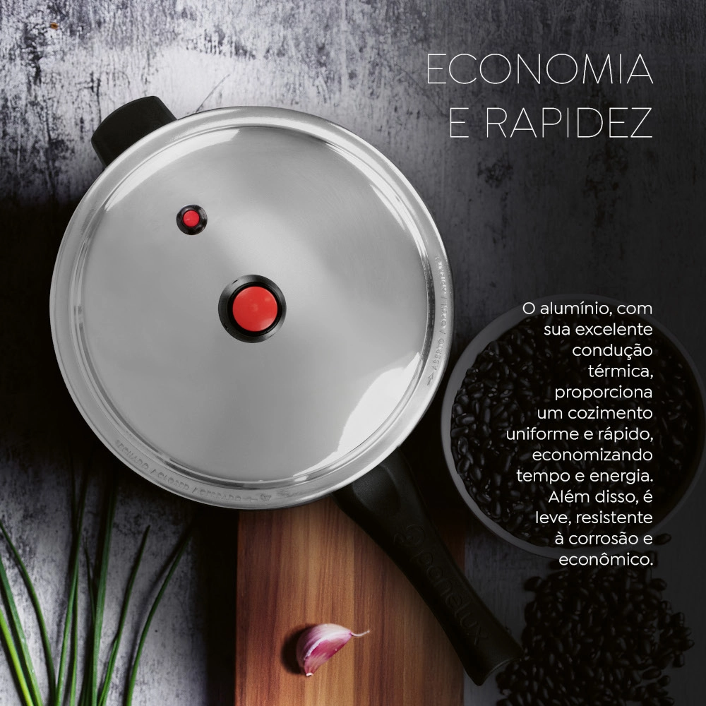 A Mais Vendida do Brasil Eleve sua experiência na cozinha com a Panela de Pressão Panelux Magnific Alto Brilho. a mais vendida do Brasil. de acordo com a pesquisa Nielsen de junho de 2023. Nossa panela combina design sofisticado. qualidade e eficiência para tornar cada refeição especial. A nossa linha de panelas de pressão conta com cabos de baquelite. que não aquecem durante o uso. Também possuímos a valvula de segurança para melhor uso da panela. Isso garante um manuseio fácil e seguro. para você cozinhar com tranquilidade e praticidade. Desenvolvida com uma variedade de capacidades – de 3 a 10 litros – e espessuras que garantem durabilidade. ela se adapta perfeitamente à sua rotina. seja para o preparo de refeições do dia a dia ou para grandes eventos. A tecnologia avançada da Panelux Magnific proporciona cozimento rápido e eficiente. resultando em uma economia significativa de gás de cozinha. Cozinhar nunca foi tão prático e saudável. Com a Panelux Magnific. suas refeições são preparadas com rapidez. preservando o sabor e os nutrientes. Ideal para feijões. carnes. sopas e muito mais. ela é o item indispensável para quem ama cozinhar com agilidade e segurança. 3 litros com 1.4 mm de espessura 4 litros com 1.4 mm de espessura 4.5 litros com 1.4 mm de espessura 7 litros com 1.8 mm de espessura 10 litros com 2.3 mm de espessura Essa variedade permite que você escolha a panela ideal. seja para preparar refeições individuais ou para toda a família. Economia de Gás de Cozinha Desenvolvida com tecnologia avançada. a panela de pressão Panelux Magnific é projetada para proporcionar uma economia significativa de gás de cozinha. Seu sistema de cozimento rápido reduz o tempo de preparo. permitindo que você cozinhe de forma mais eficiente e econômica. Rapidez nos Cozimentos Com a panela de pressão Panelux Magnific. você pode preparar alimentos de maneira ágil. mantendo os sabores e nutrientes. Ideal para quem tem uma rotina agitada. essa panela é perfeita para sopas. feijões. carnes e muito mais. garantindo refeições saborosas em menos tempo.