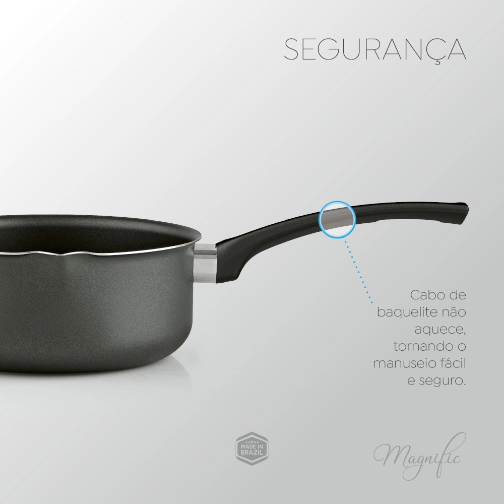 O alumínio antiaderente distribui o calor uniformemente e o cabo em baquelite garante segurança ao manusear.